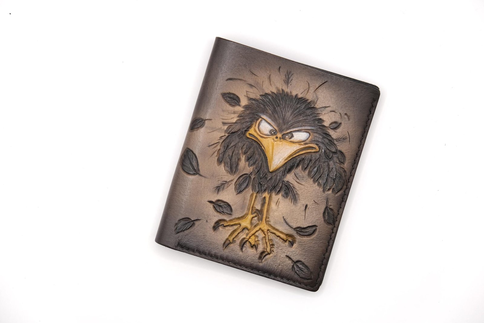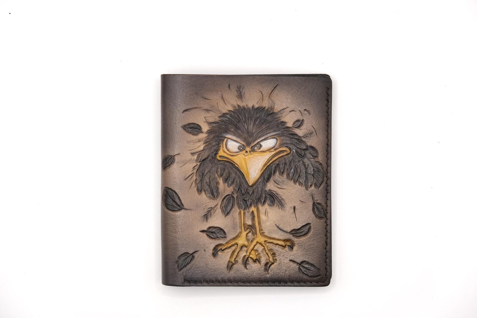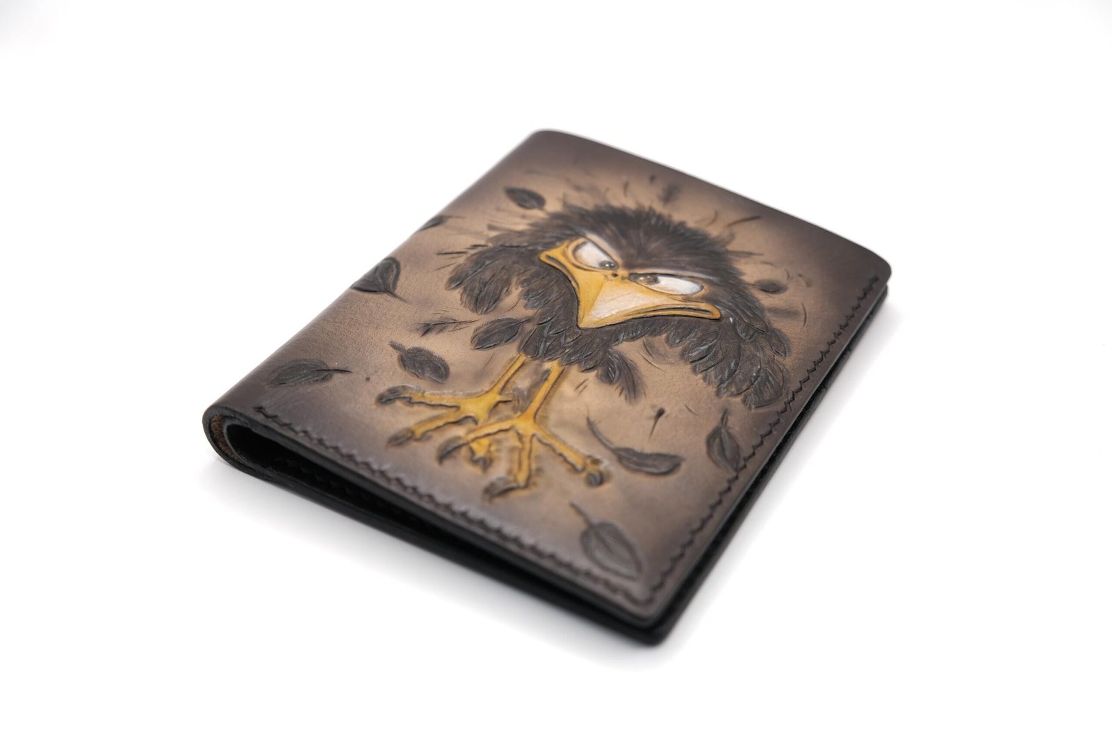 Black Funny Bird Hand-Carved Leather Wallet – Whimsical Handcrafted Design, Unique Gift, Animal-Inspired Art, Alohaleather