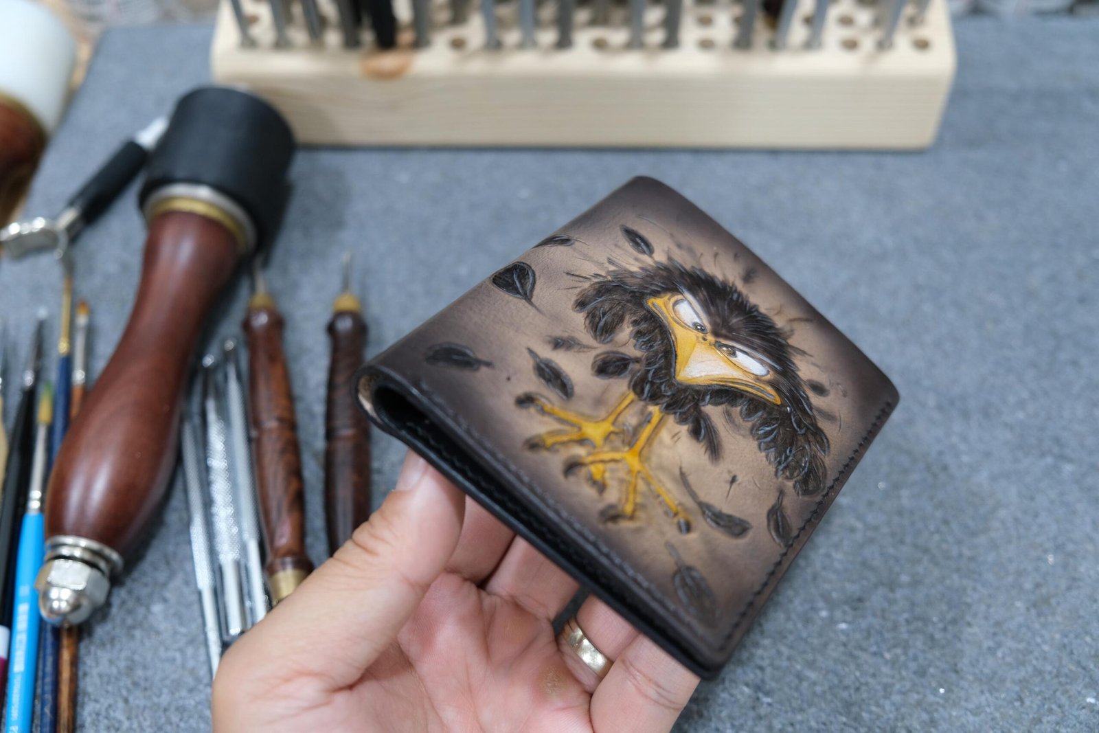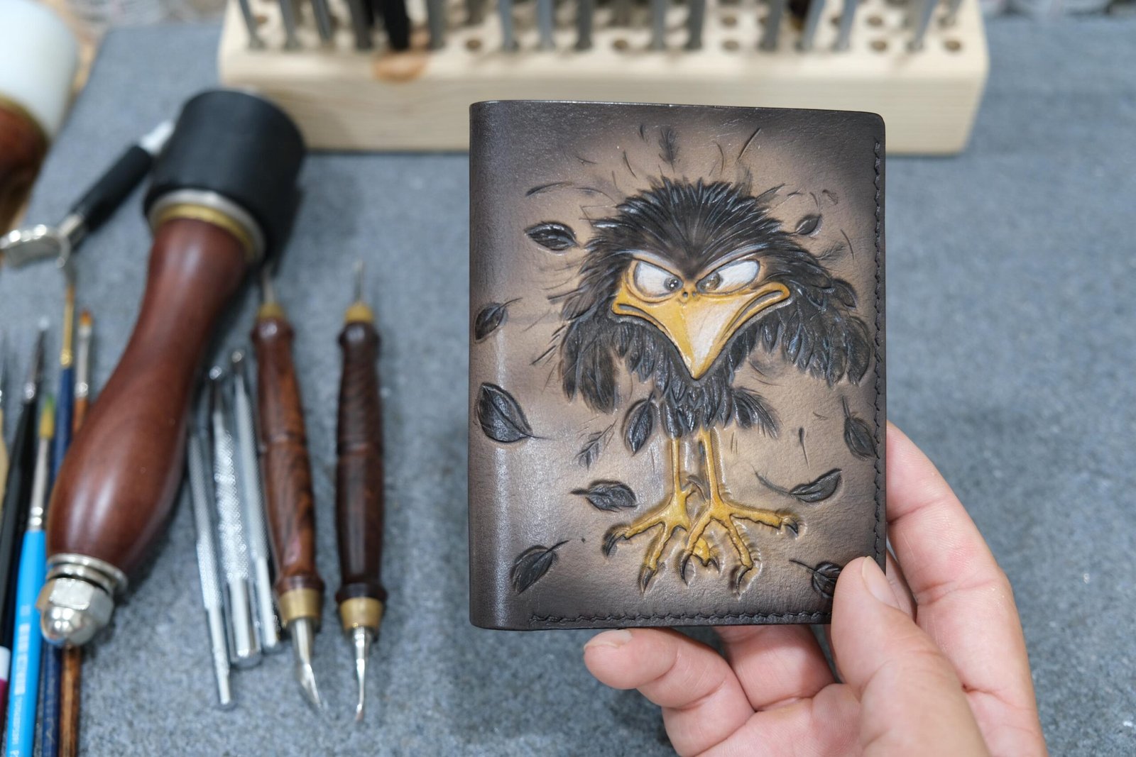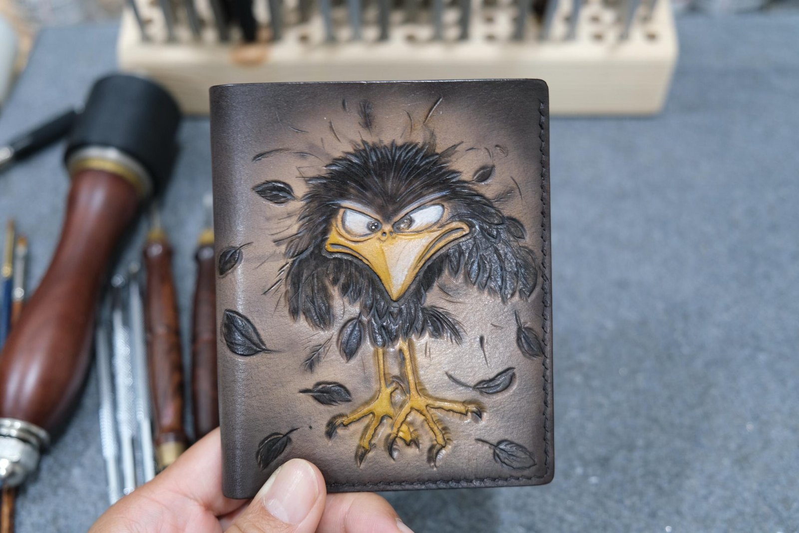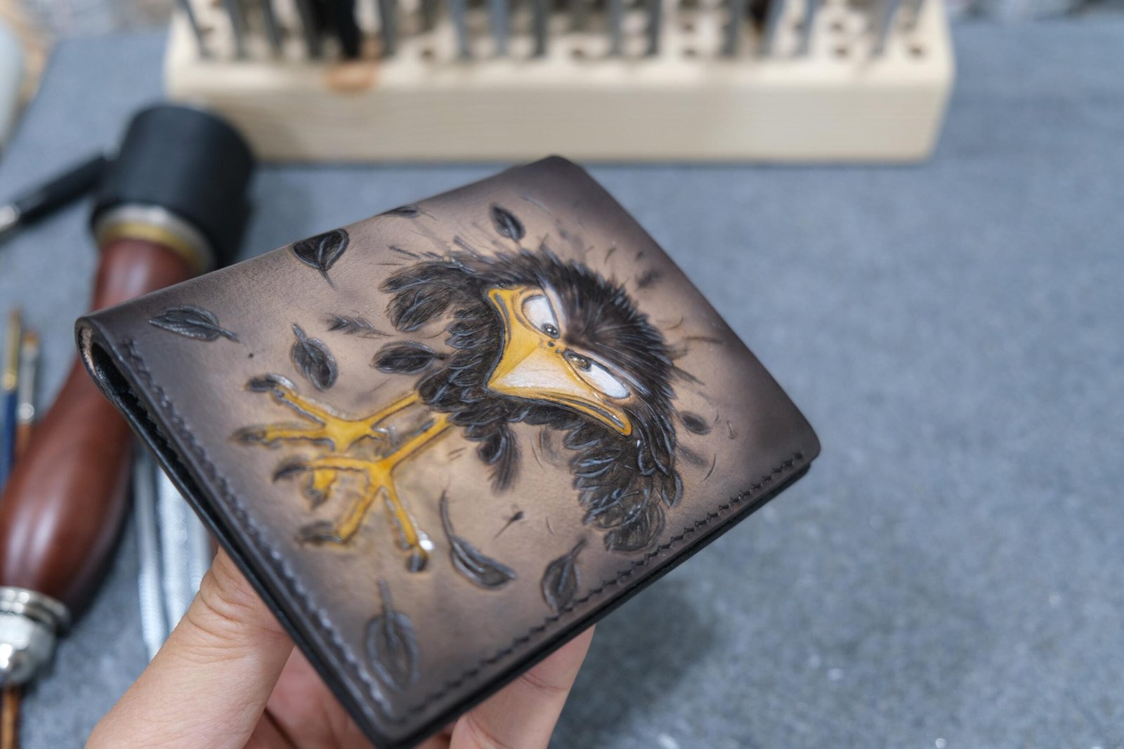 Carry a wallet that sparks joy with this Black Funny Bird hand-carved leather wallet—crafted for those who appreciate artistry, humor, and individuality.